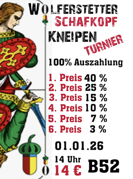 Einlass: 17 Uhr, Beginn: 18 Uhr. Der Einsatz beträgt 12€, Spielmodus "kurzes Blatt". Es gibt Geldpreise (1. Platz: 500€, 2. Platz: 300€, 3. Platz: 150€, 4. Platz 75€) sowie wertvolle Sachpreise zu gewinnen. Für das leibliche Wohl ist gesorgt!