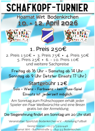 Voranmeldung (so lange Plätze frei sind): bis 01.04.2026 per Email: schafkopfrennen@msf-olching.de am 02.04.2026 ab 17 Uhr telefonisch: 08142 / 6539465 beschränkte Tischanzahl; Jeder Spieler erhält einen Preis; 08142 / 6539465 langes Blatt, mit Solo, Wenz und Farbwenz Plus Punkte Web: https://www.msf-olching.de/