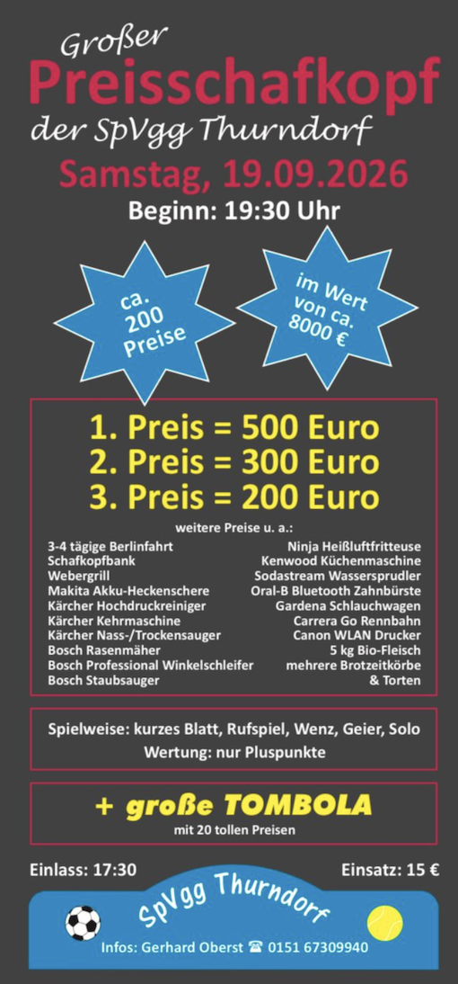 Packt die Karten aus und übt schon mal eure Soli – es ist wieder Zeit für einen gemütlichen und spannenden Abend in unserem Sportheim. Wir laden herzlich ein zu unserem traditionellen Preisschafkopf!
