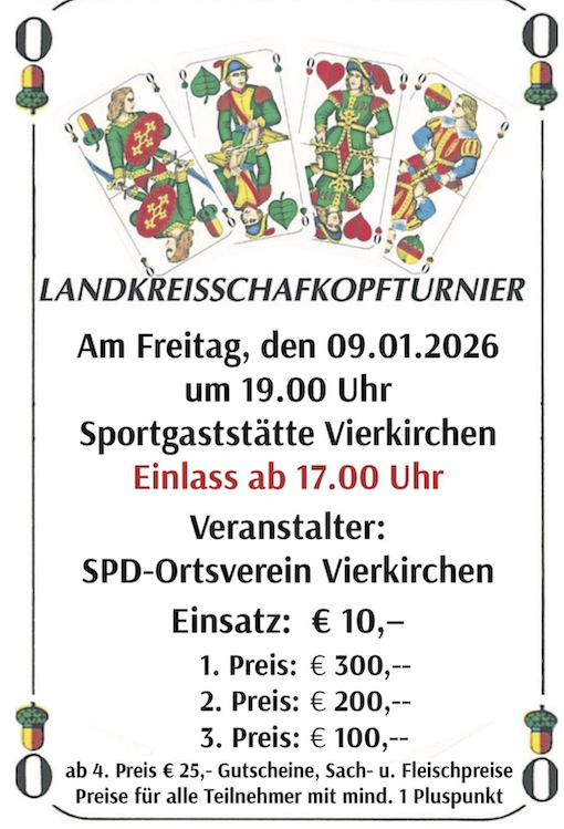 Ab 4. Platz 25 €-Gutscheine. Jeder Teilnehmer mit mindestens 1 Pluspunkt erhält einen Preis. Anmeldung nicht erforderlich, rechtzeitiges Erscheinen erwünscht. 01715227978 langes Blatt, mit Solo und Wenz Plus Minus Punkte